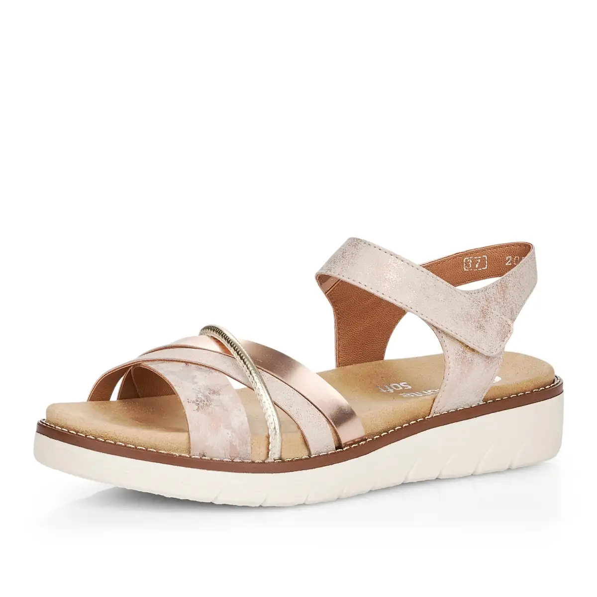 Obutev REMONTE je višja linija blagovne znamke RIEKER, obutev odlikuje kakovost uporabljenih materialov. Zgornji del teh sandalov je izdelan v edinstvenem dizajnu, trakovi različnih širin spredaj pa so prvotno prekrižani. Pritrditev tega modela je rešena z gleženjskim trakom z elastičnim trakom, ki je zategnjen z ježkom. Edinstven odstranljiv vložek zagotavlja celodnevno udobje, beli podplat z robom s tanko rjavo črto pa natančno prilagodi celoten videz čevlja do popolnosti. S temi sandali se boste počutili elegantno v vsaki situaciji, ta model ponujamo v več barvnih oblikah.